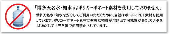 容器は安全性の高いPET素材を使用し、自社工場で製造しております。有毒物質が溶け出す恐れがあるとして世界数か国で使用が禁止されている「ビスフェノールA」は使用しておりません。